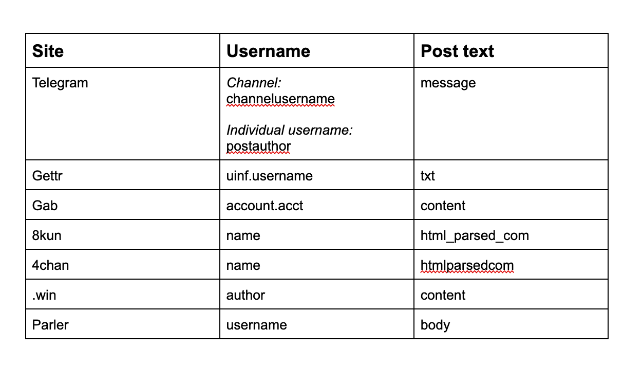 NOTE: JSON is just a term for a type of data format commonly used on the web. It contains nested “keys“ and “values.” One way to think about it would be in a workplace table, you would have a few classes called “keys,” such as “employee name” or “employee position,” that would each have a unique value. Those values can then be nested in something else (e.g., the larger department or city an employee works in). For our data, the JSON has many different fields such as the username, the post itself, the time posted, and other details. We recommend using a browser like Firefox, because it auto-formats the JSON for you. We present the JSON as close to as exact as it was represented on the native site the data was crawled from.