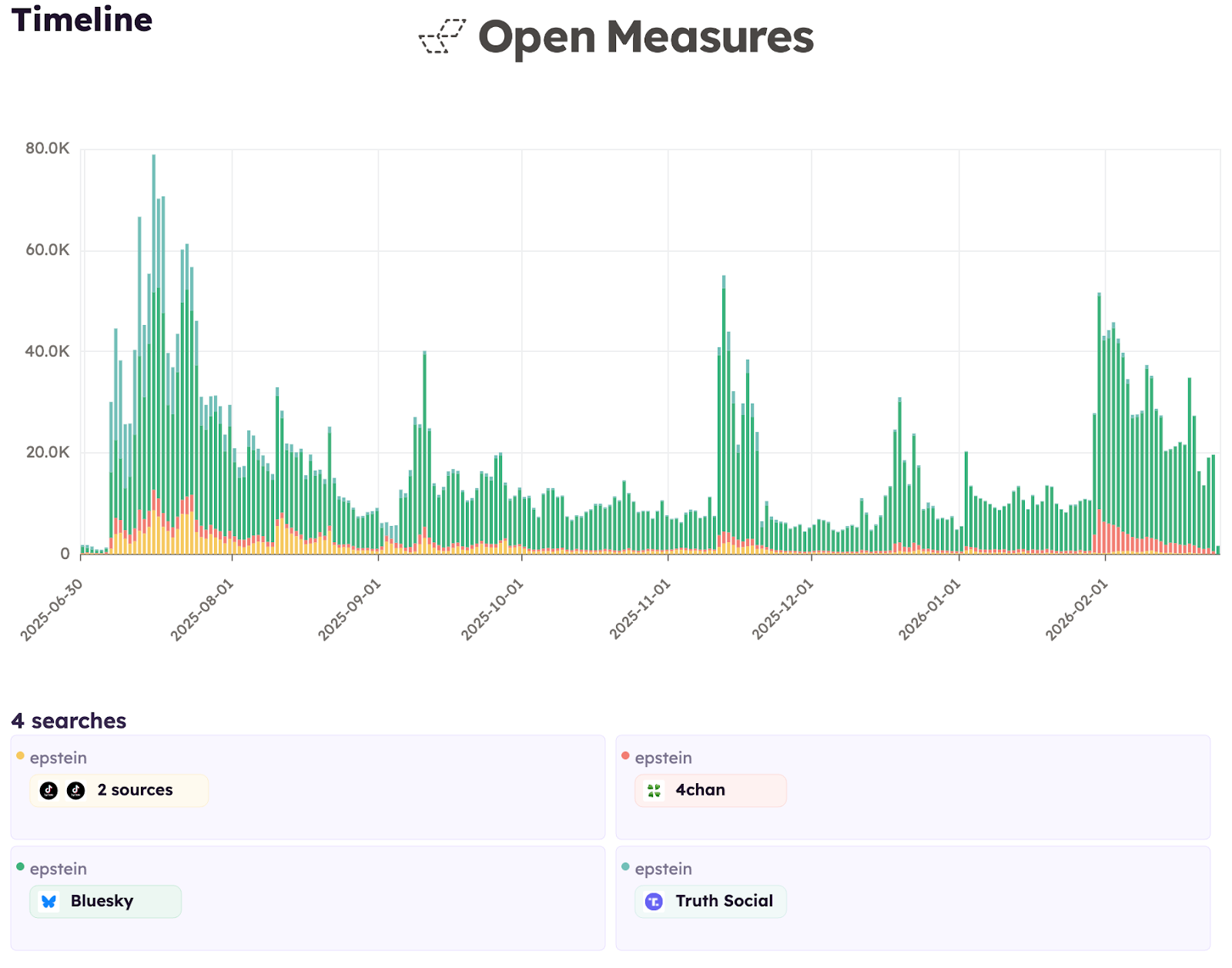 Our researchers performed a broad initial search of Open Measures’ crawled platforms for posts mentioning “Epstein,” narrowed the results to only those created since members of Congress introduced the Epstein Files Transparency Act in July 2025, and identified the four platforms with the most posts during that period for analysis: TikTok, Bluesky, Truth Social, and 4chan. For each narrative, they created search queries meant to surface related posts and manually reviewed the results to identify relevant content:
