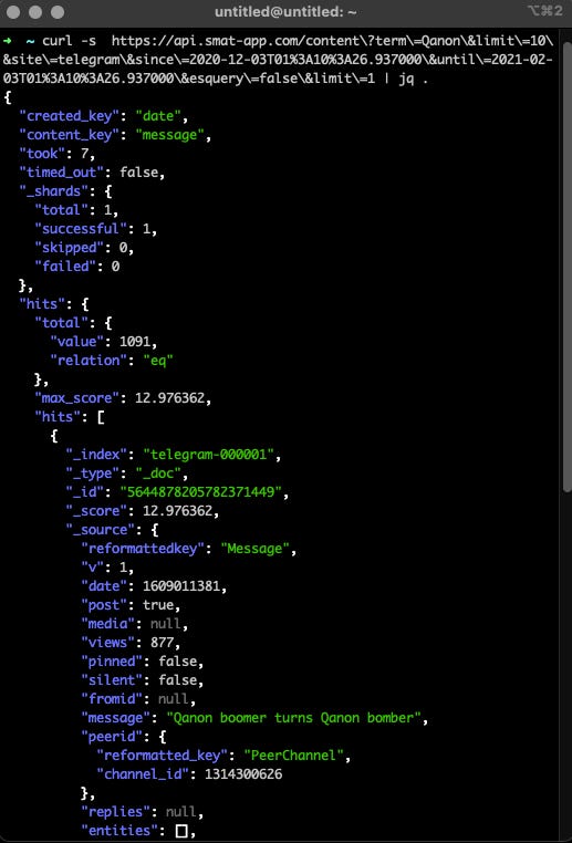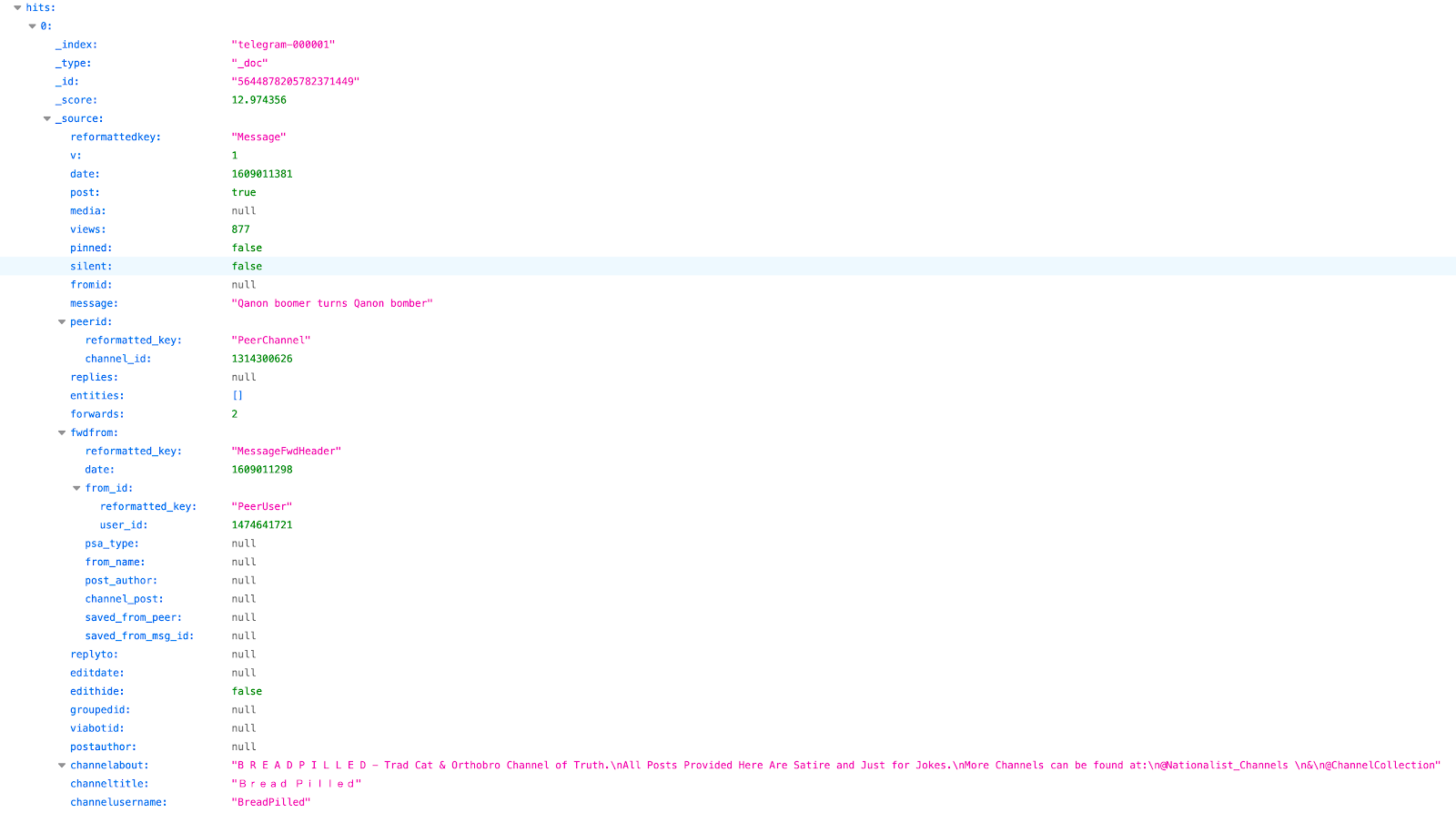 Everything is nested in “hits” and “_source” for all of our data as you can see but the key fields for Telegram for most use cases are: