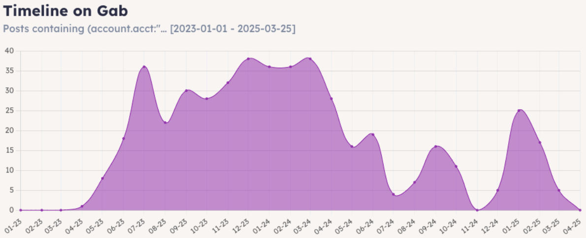 On Gab, Tate was active in fits and starts before becoming regularly active in March 2023. From March 2023 through the end of 2023, Tate posted an average of 58 times per month. In 2024, that number dropped to ~20 posts per month. For the first three months of 2025, that number is 17.
