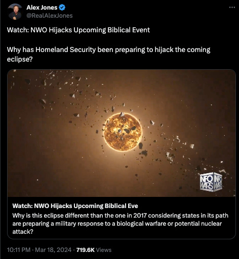 Conspiracy theorist Alex Jones released a video on X about the eclipse in mid-March, implicating the US Department of Homeland Security and referencing the Bible.