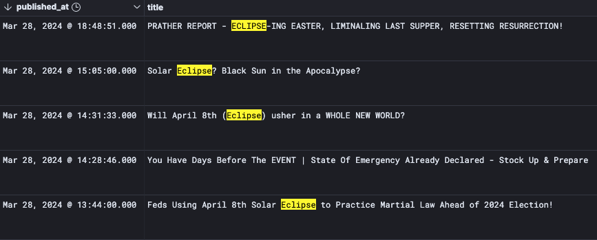 In contrast, the 2024 solar eclipse has garnered over 1,200 mentions on the platform over the past month, though this may be a result of the likely growth of Rumble’s user base in the intervening years. Interestingly, much of the content reviewed from that period appears to be benign, information-oriented news about the eclipse, the majority of which occurred on the day of the eclipse itself.