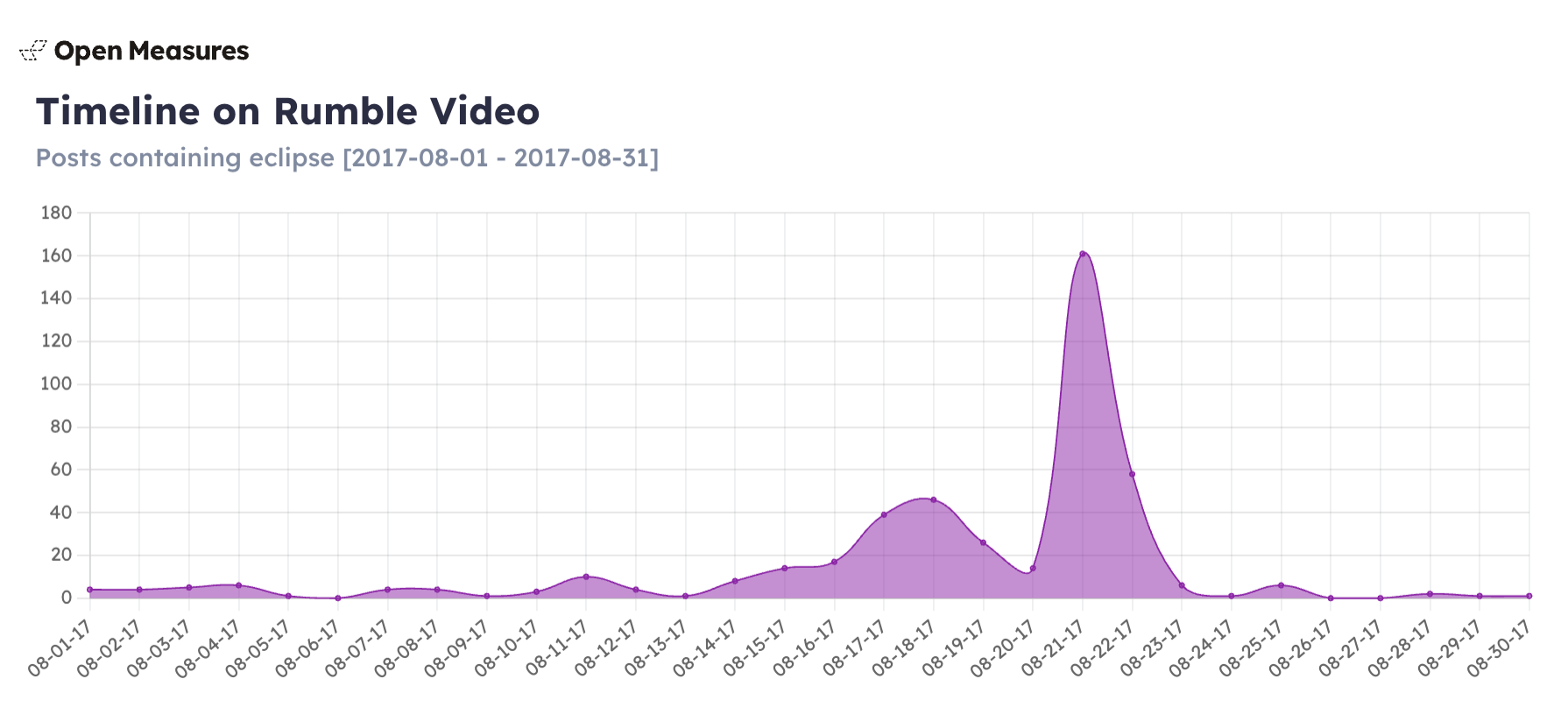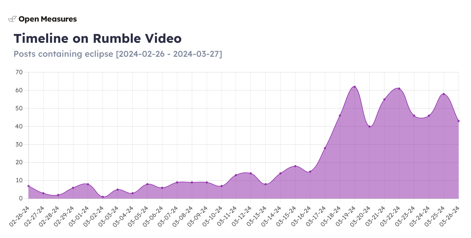 For a point of comparison, researchers at Open Measures examined chatter on Rumble surrounding the solar eclipse on Aug. 21, 2017, the last one to pass over continental US.