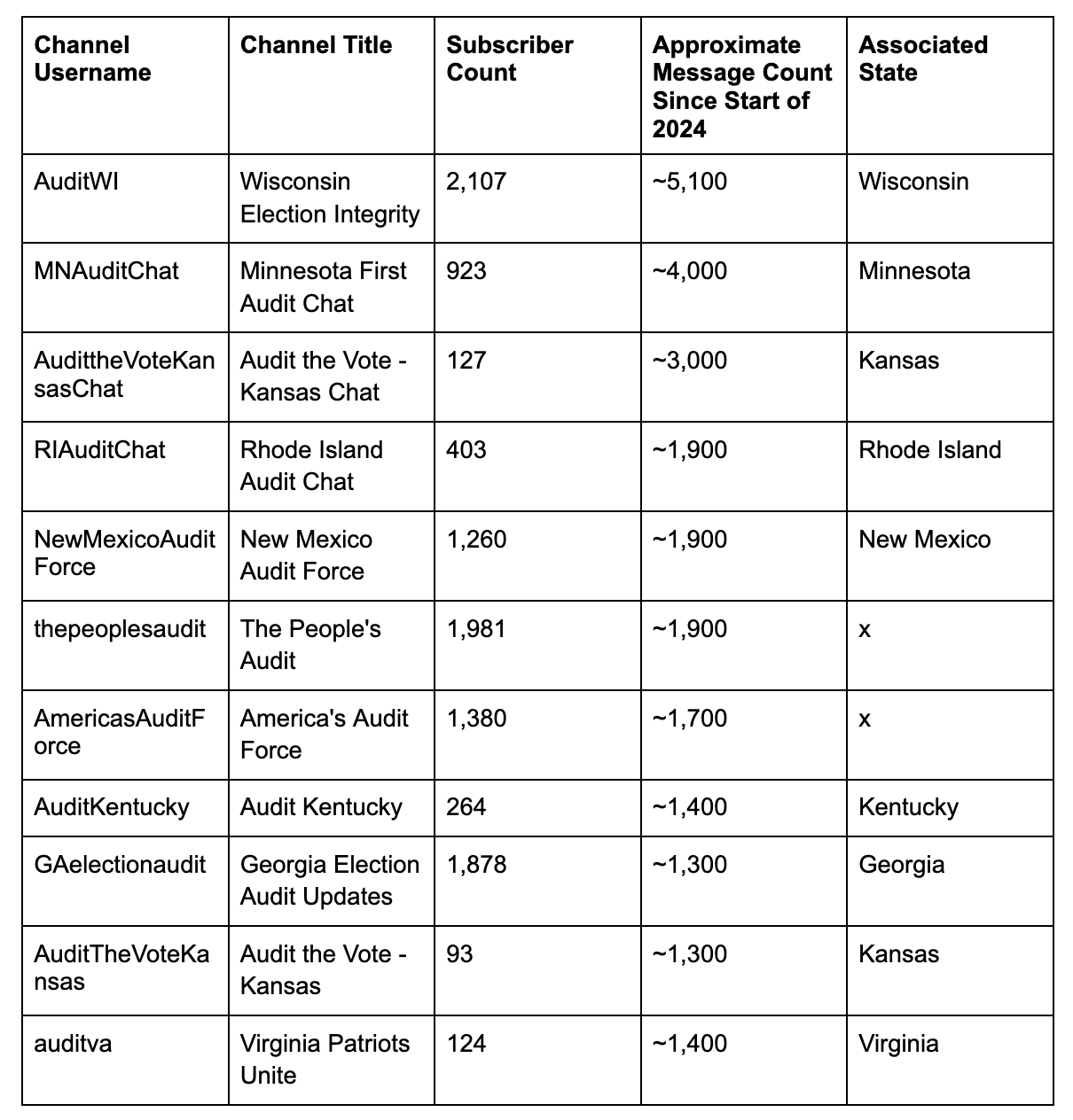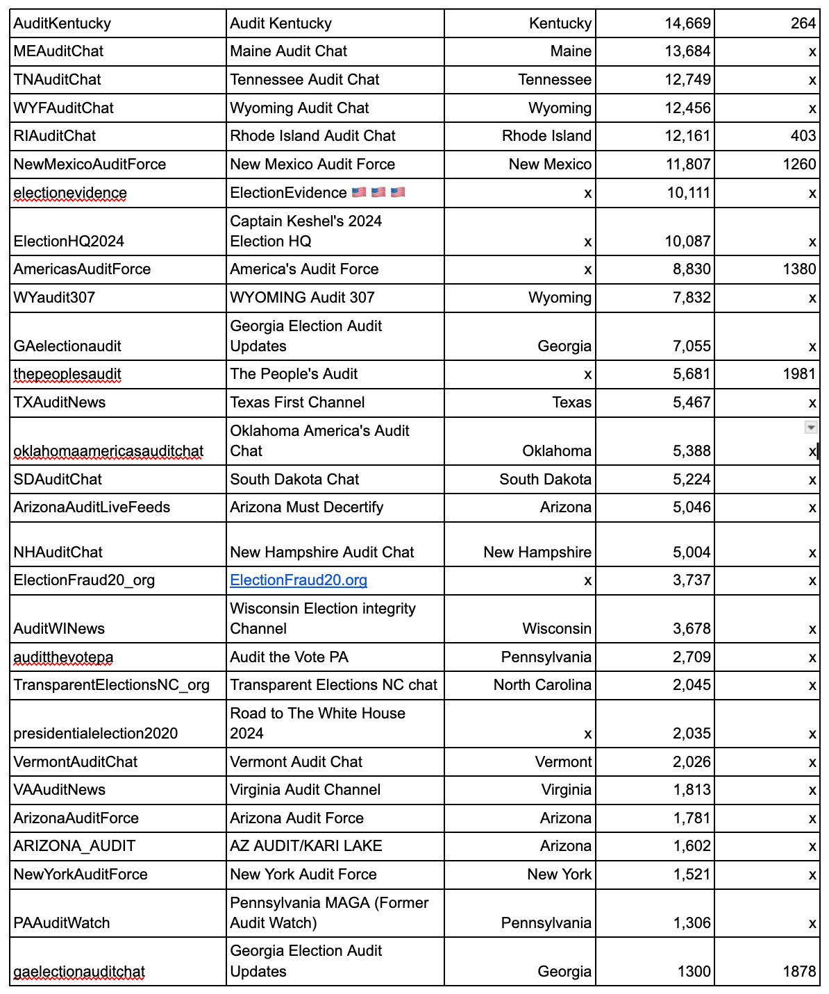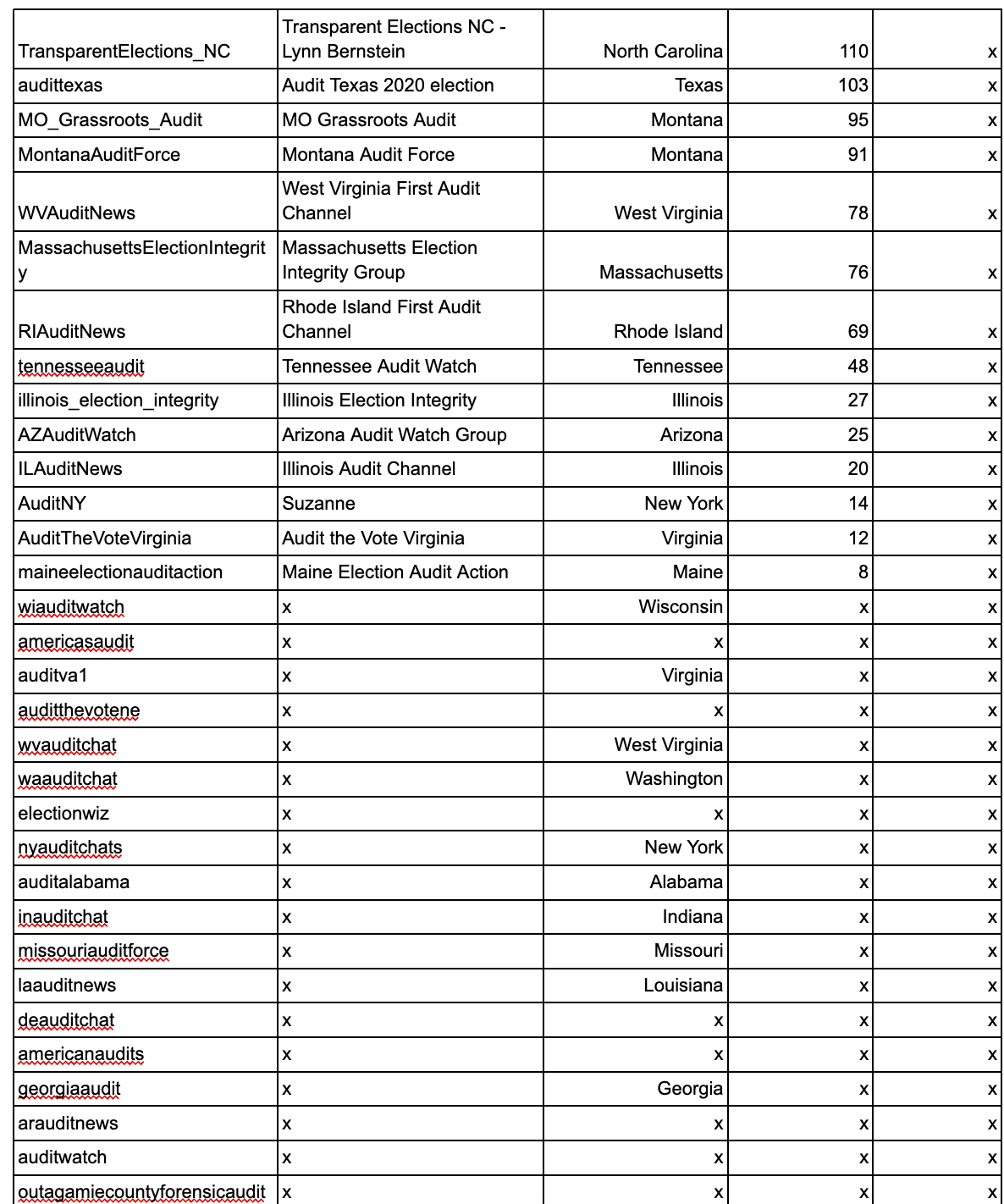 It is notable that audit groups dedicated to several swing states (Georgia, Minnesota, Wisconsin, and Virginia) make this list. Further, many of these channels share content from one another or from the same content creators and information outlets.