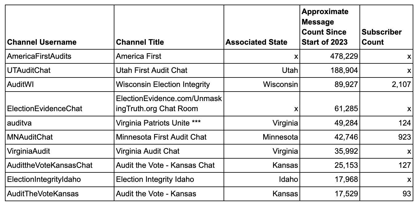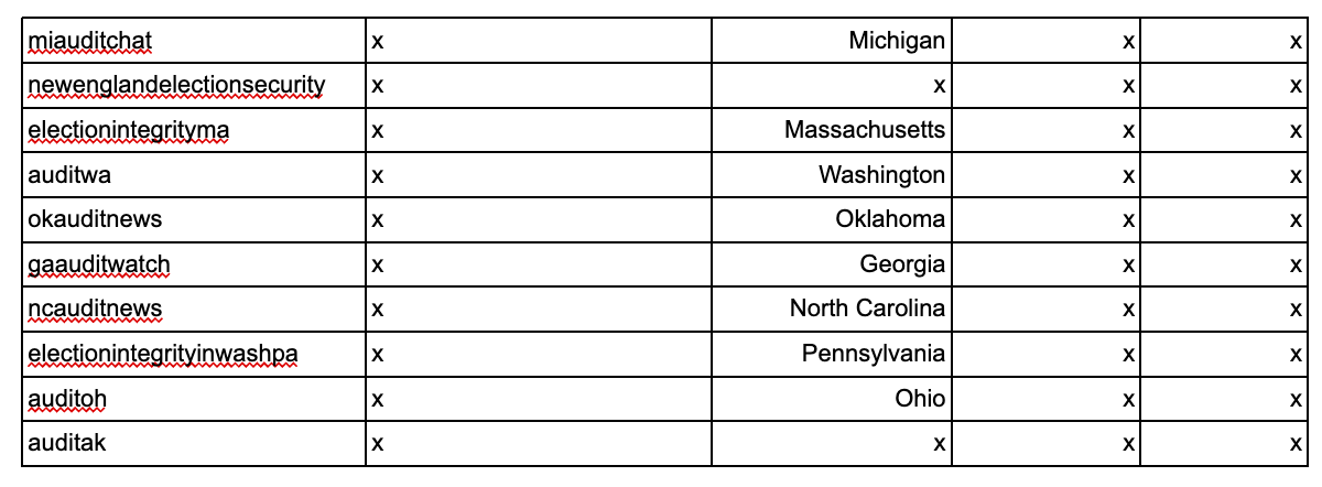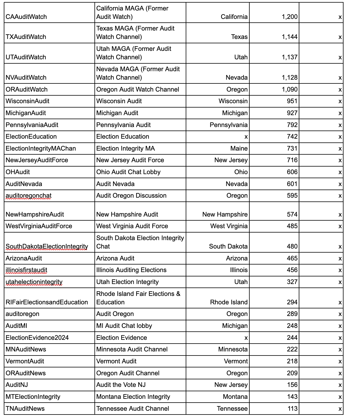 It is notable that audit groups dedicated to several swing states (Georgia, Minnesota, Wisconsin, and Virginia) make this list. Further, many of these channels share content from one another or from the same content creators and information outlets.