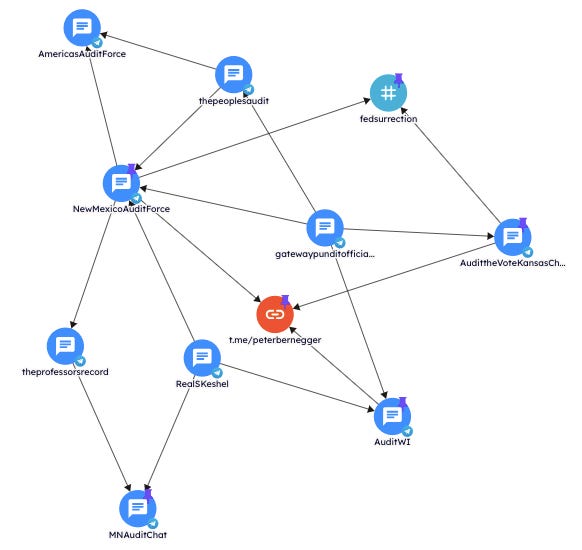 “New Mexico Audit Force”, “Audit the Vote - Kansas Chat”, and “Wisconsin Election Integrity” all shared links to a Telegram channel dedicated to Peter Bernegger, a prolific Wisconsin election denier.3