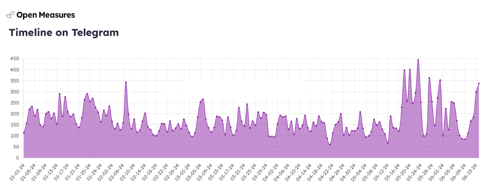 Open Measures researchers traced this type of Telegram activity to as early as May 2021. However, for this analysis, Open Measures looked at the 10 most active Telegram channels dedicated to election integrity since the start of 2024. To visualize this, researchers created a chart showing message volume.