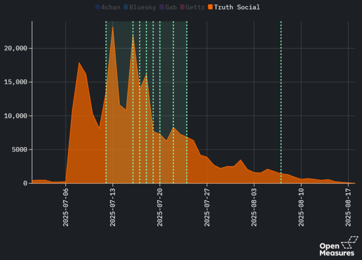 As national media outlets redirected coverage away from Epstein, Open Measures sought to assess whether Epstein had remained a focus of discussion on platforms hosting large communities of Trump supporters. Researchers used our analysis toolkit to determine the volume of posts mentioning Epstein per day on Truth Social — a microblogging social network platform owned by Trump Media & Technology Group — between Jan. 20 (Trump’s second inauguration) and Aug. 18, 2025. Researchers chose Truth Social because it has been Trump’s primary social platform since he was banned from Twitter in 2021.