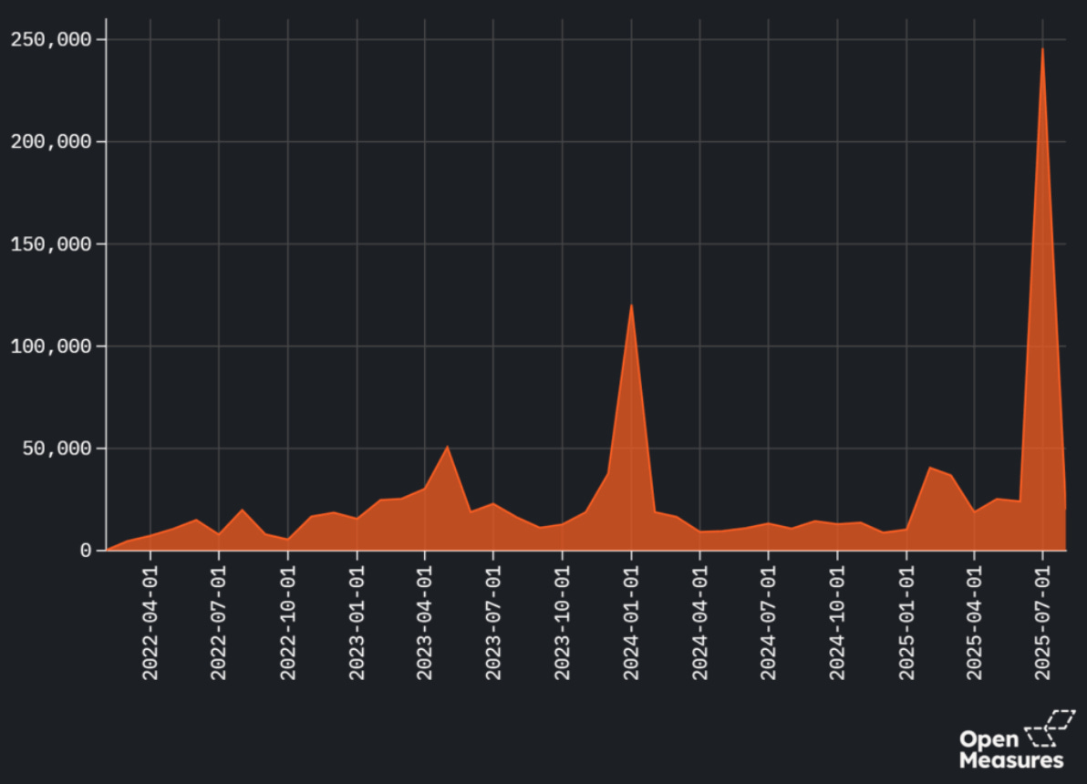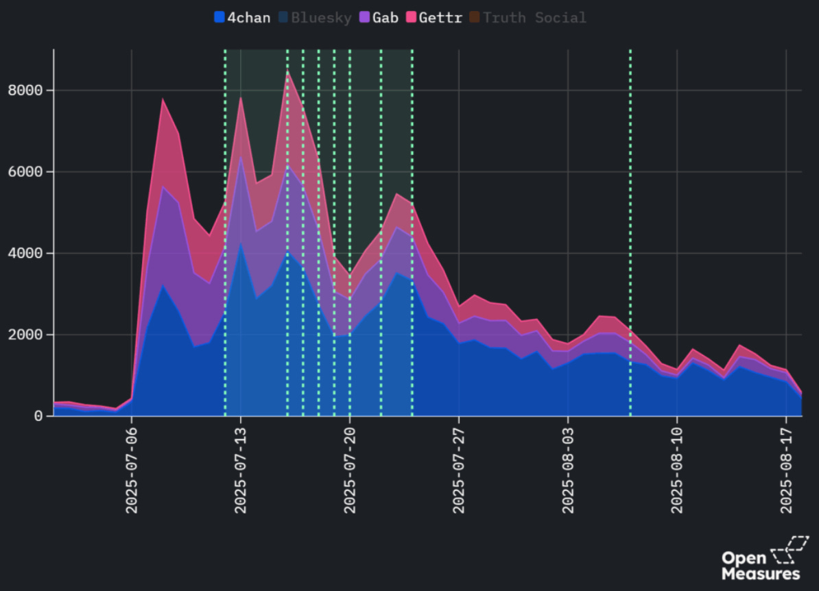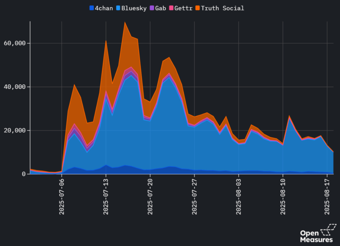 Open Measures' dataset captured more than 1.7 million posts mentioning Epstein by name across the five platforms mentioned above between Jan. 20 and Aug. 18. More than 77% of those posts appear after July 6, when news broke about the FBI and DOJ memo stating no further disclosures would be made regarding the Epstein investigation.