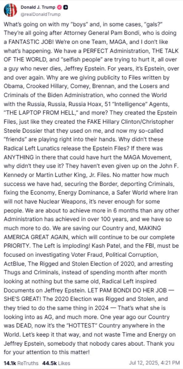 Facing backlash from supporters, Trump and his administration launched efforts to contain the backlash.3 Trump discouraged further discussion of the Epstein inquiry and expressed frustration with conservatives who were criticizing his administration's handling of the matter. Supporters of the administration in both media and politics focused on other issues, while Trump dismissed renewed scrutiny of his personal relationship with Epstein as a "hoax" manufactured by Democrats.4 Meanwhile, as other major stories developed, national news outlets directed coverage to other topics, like deadly flooding in Central Texas, humanitarian concerns in the Israel-Hamas war, new escalations in the Russia-Ukraine war, and more.