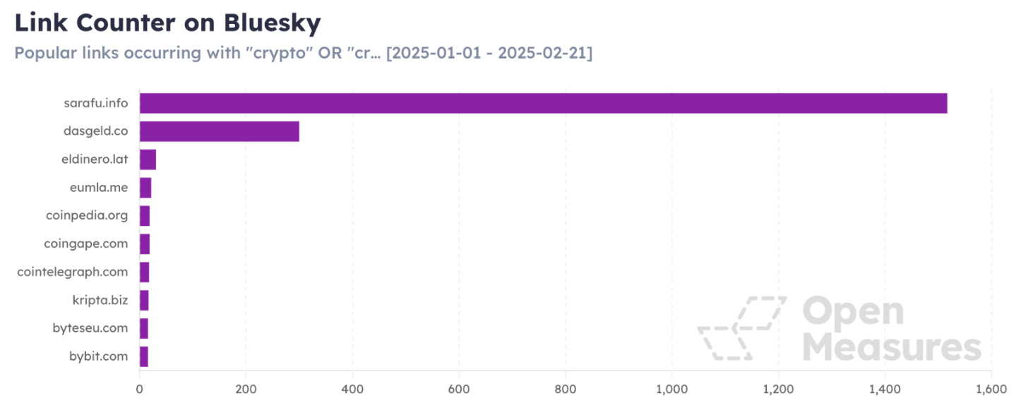 Not all crypto-related accounts engage in deceptive or scam behavior and many posts appear to be from authentic accounts. However, a key element of fake or spam account behavior is if an account tries to drive users to malicious websites or solicit personal user information. Using the Link Counter tool, researchers pulled the top domains that appear in Bluesky posts that used the same subset of crypto-related terms previously mentioned.