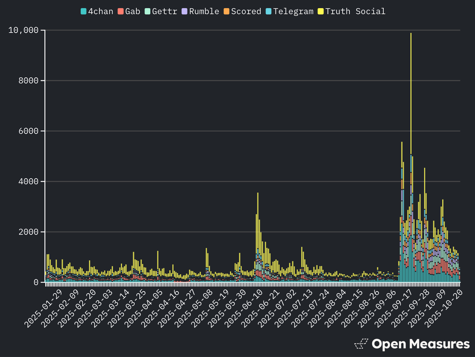 Open Measures sought to identify posts mentioning terms like “Antifa” and the so-called “radical left” on seven alt-platforms dominated by right-wing communities in their US contexts – 4chan, Gab, Gettr, Rumble, Scored, Telegram, and Truth Social – since Trump began his current term on Jan. 20, 2025. Our researchers used the following search string: