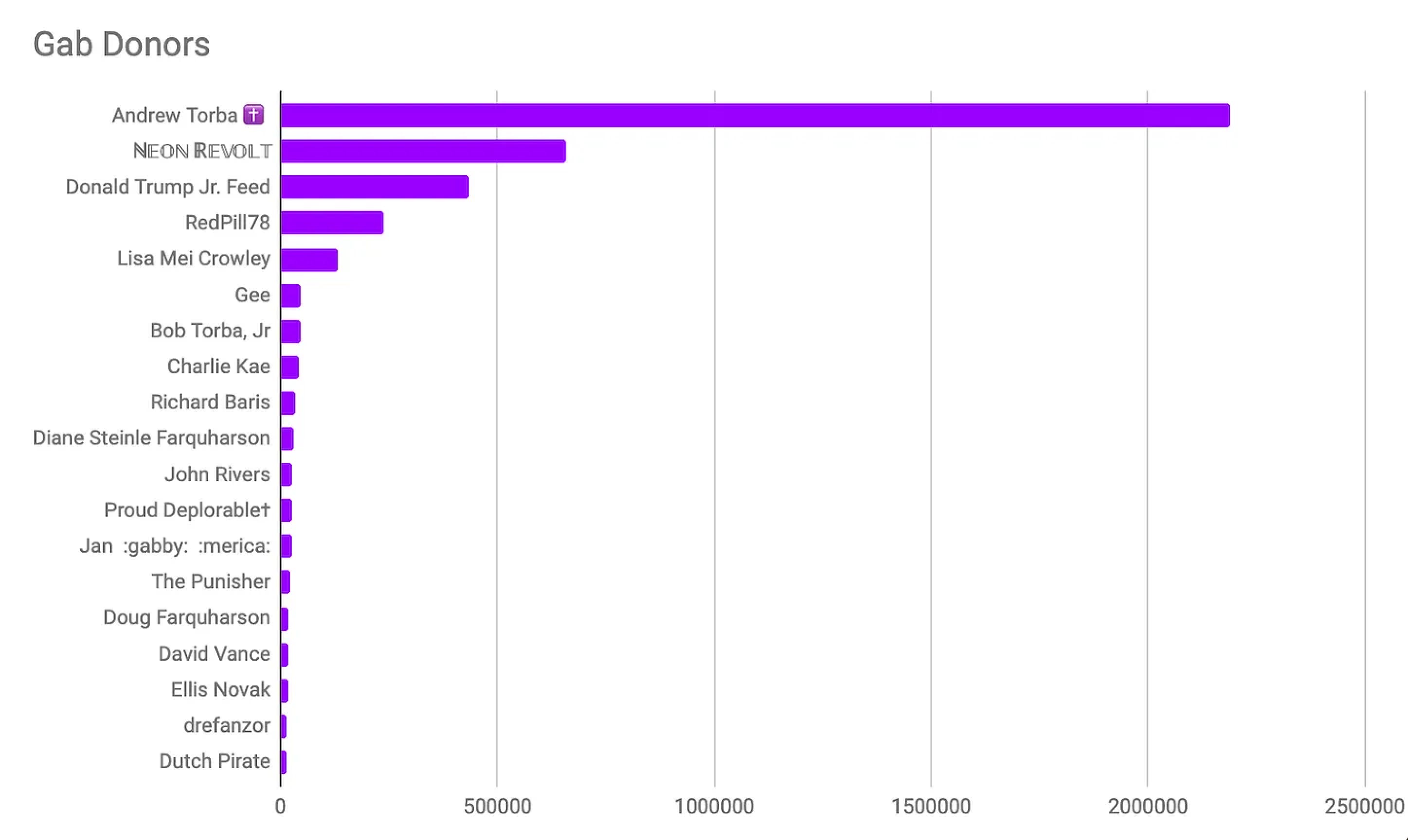 From public documents and recent Gab leaks (of which Open Measures analyzed everything public in addition to our own data), we can now release a preliminary analysis, from which our researchers gleaned some financial information. This release was compiled from user profiles and should be nearly complete as of the time of the leaks.