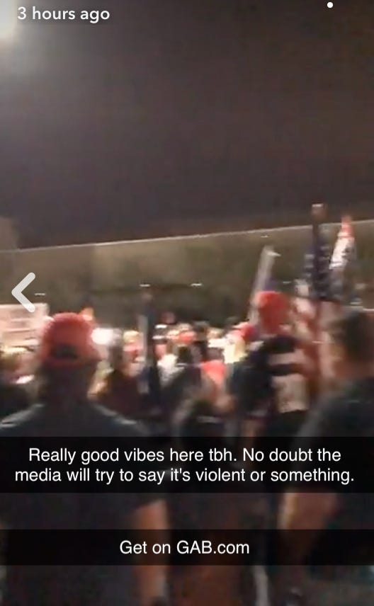 By far the most active group in the election period was the QAnon group administered by Neon Revolt, with “thedonald” and “Stop the Steal” close behind. In DMs released by DDoSecrets, we also found Neon Revolt seeming to offer users free pro accounts in addition to other insider behavior, alluding to power in the organization. There were also various real world shout-outs to Gab in election worker intimidation demonstrations, such as one in Phoenix, Arizona.