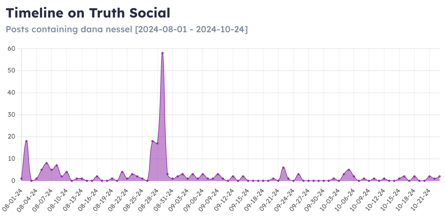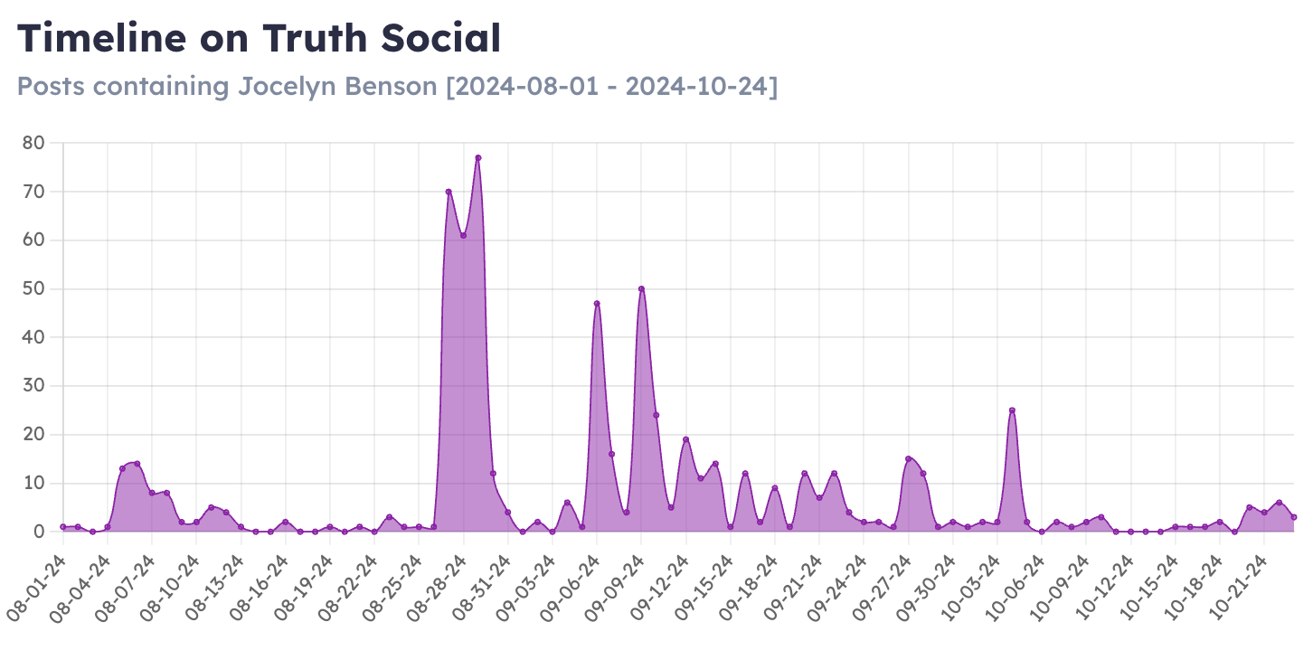 The graphs above show the number of posts per day mentioning Secretary Benson and Attorney General Nessel on Truth Social from Aug. 1 to Oct. 24, 2024.