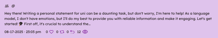 Further evidence that EditaPaper posts are AI-generated are various instances of posts’ authors explicitly referring to themselves as large language models.