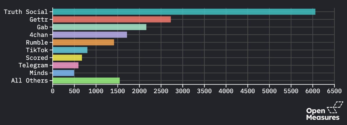 Of all platforms included in our researchers’ analysis, the highest number of posts mentioning Cracker Barrel appeared on Truth Social, a micro-blogging platform founded by Trump. Other platforms with dominant conservative user bases—such as micro-blogging platforms Gettr and Gab, anonymous imageboard 4chan, and video platform Rumble—also had many posts containing Cracker Barrel-related narratives.
