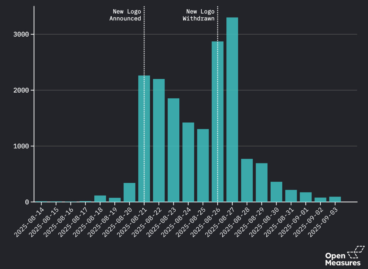 Open Measures sought to better understand the outrage directed at Cracker Barrel following the attempted debut of its new logo. Using our proprietary tooling, our researchers analyzed posts mentioning Cracker Barrel from Aug. 14 to Sept. 3, 2025 (from a week before the new logo announcement on Aug. 21 to approximately two weeks after). Researchers chose this timeframe to capture the height of backlash against the company and calmer periods surrounding it.