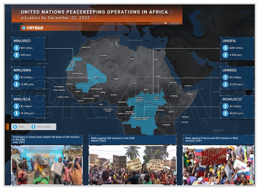 On 03 January 2023, Rybar published a three-part series titled ‘Why UN peacekeeping missions are useless in Africa’. In the introduction to the series, Rybar claims that Western politicians are opposed to Russia’s presence in Africa because they believe the UN is already operational in these countries and that further foreign intervention is counter-productive. The series describes the different UN missions in Africa, when they were constituted, and what Rybar claimed to be their failures. These UN missions include MINURSO in Western Sahara; MINUSCA in CAR; MINUSMA in Mali; MONUSCO in the DRC; the United Nations Interim Security Force for Abyei (UNISFA) in Abyei, a contested area on the border between Sudan and South Sudan; and UNMISS in South Sudan. The series concludes by providing reasons for the alleged low effectiveness of UN representatives in these countries. Rybar points to corruption, arms smuggling, and a lack of motivation for UN troops to risk their lives. Rybar also argues that, despite these missions’ alleged failures, they are unlikely to end since, by their presence, the UN’s key Western donors continue to exercise control over local governments and authorities. It also alleged that Western companies continue to enrich themselves from minerals in these countries which in turn causes conflict and, thus, the need for funded missions. Rybar did not present evidence of Western countries exploiting the minerals of the countries where UN missions are deployed.