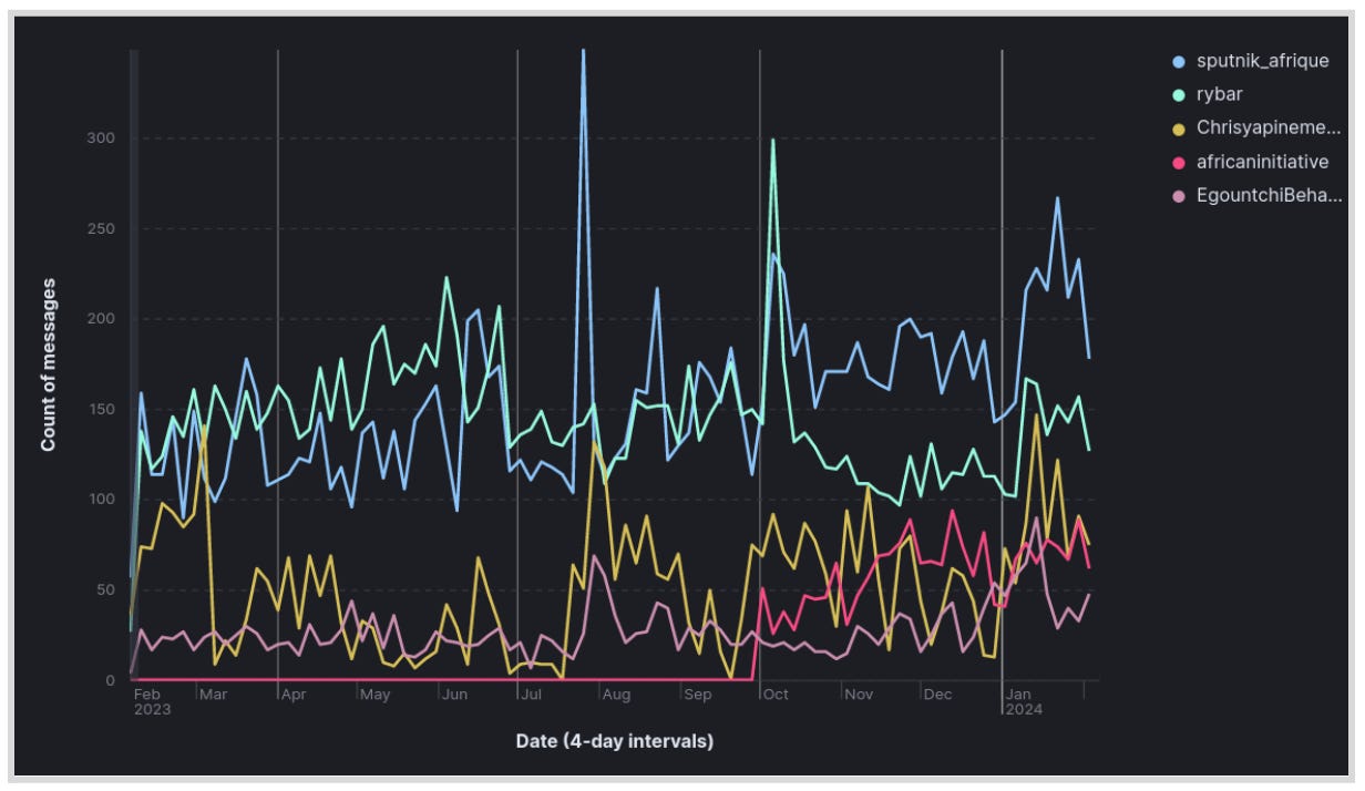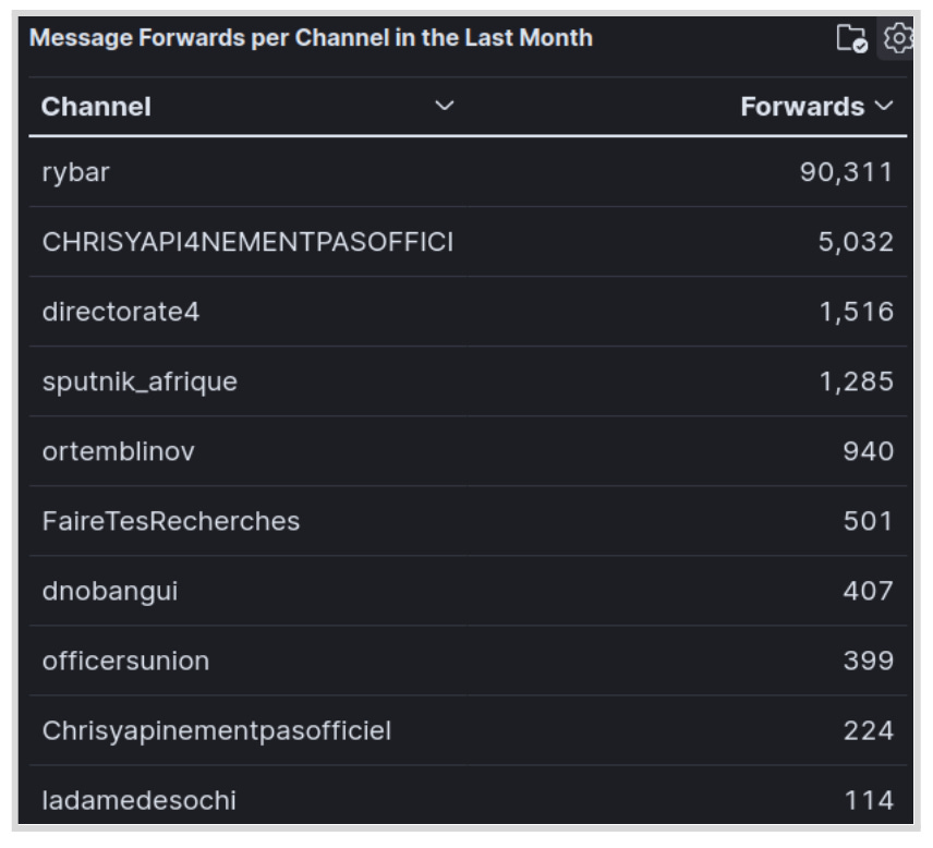 Larger channels typically experience more forwarding of their messages. For example, the Rybar channel — with almost 1.2 million subscribers — had 90,000 message forwards in January 2024. Channel size, however, is not necessarily an indicator of the number of forwards. For example, Sputnik Afrique (22,000 subscribers) had 10 times as many forwards as Le Dame de Sochi (42,000 subscribers). Forwards enable posts to reach a wider audience because the posts are viewed by the subscribers of the channel and the subscribers or members of the channels or groups that forward the message. The messages can also be forwarded to individual Telegram accounts. For instance, one of African Initiative’s most popular posts was about the arrival of Russian troops in Burkina Faso. Although the channel has about 21,000 subscribers, the post on 24 January 2024 received more than 1.6 million views and 531 interactions after being forwarded to 93 public Telegram channels and groups, as well as 3,200 individual Telegram accounts.