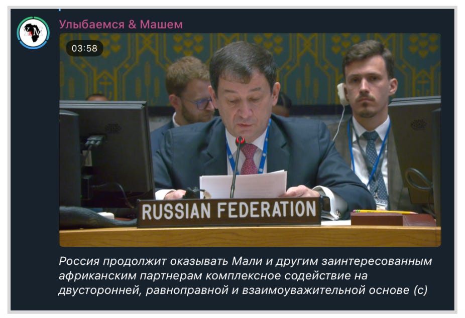 The information manipulation and disinformation campaigns often position Russian military involvement as a more effective and transparent alternative to UN missions. The ‘Smile and Wave’ (Улыбаемся & Машем) channel suggested that Russia initiated MINUSMA’s exit from Mali, indicating that Russian military specialists might replace UN peacekeepers. This narrative aligns with Russia’s strategic interest in expanding its influence and military presence in Africa.
