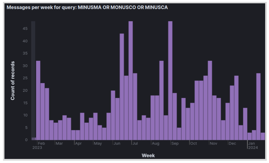 Below is a bar chart showing the number of weekly messages when querying for MINUSMA, MONUSCO, or MINUSCA. The spike at the end of June 2023 corresponds with the official dissolution of the UN peacekeeping contingent in Mali, MINUSMA, on 30 June 2023, which pro-Russian Telegram channels celebrated. At the end of August 2023, there was an increase in posts when security forces killed dozens of people in a planned anti-MONUSCO protest in the DRC.