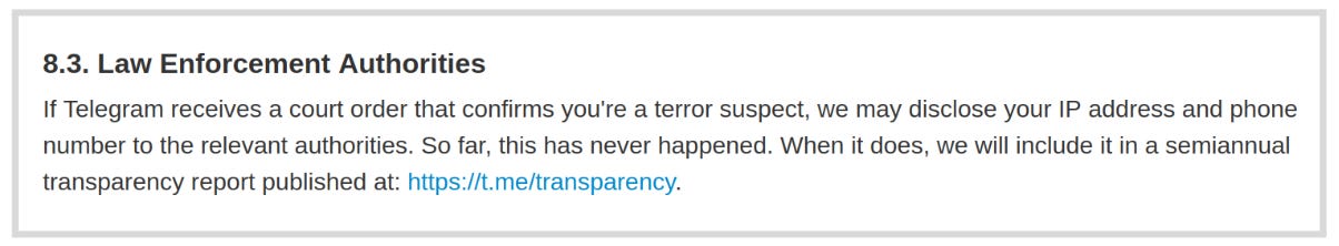 Telegram is popular among extremist organizations, fringe movements, and terrorist groups due to its history of not cooperating with law enforcement and its lack of moderation. It maintains a complicated network of shell companies to avoid complying with subpoenas from individual governments. The site’s privacy policy states: ‘If Telegram receives a court order that confirms you’re a terror suspect, we may disclose your IP address and phone number to the relevant authorities.’