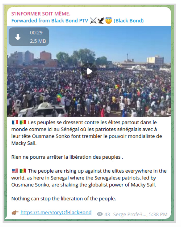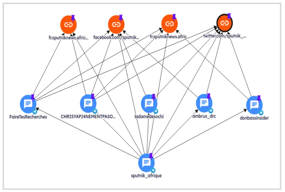 The disinformation networks use cross-posting and content sharing across multiple channels to increase reach. For instance, after sharing a story on its Telegram channel, Sputnik Afrique subsequently disseminates it across various African-focused Telegram channels. This tactic helps create an echo chamber, with the same narrative being seen across multiple sources, thus lending it credibility.