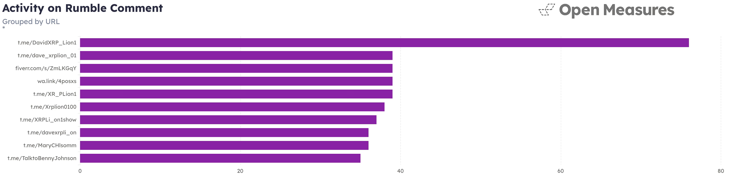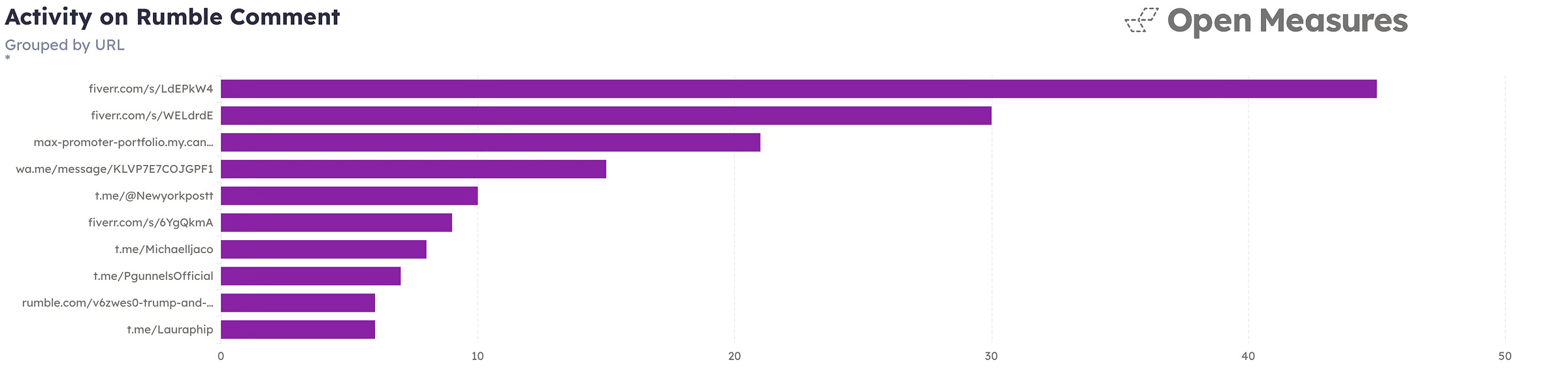 The URLs linked most frequently in Rumble comments also revealed the platform was rife with likely scammers. Looking at Oct. 5, 2024 and Oct. 5, 2025 in isolation (the first and last day of our analysis), our researchers found apparent scams targeting Rumble’s content creators as well as financial scams involving cryptocurrency.