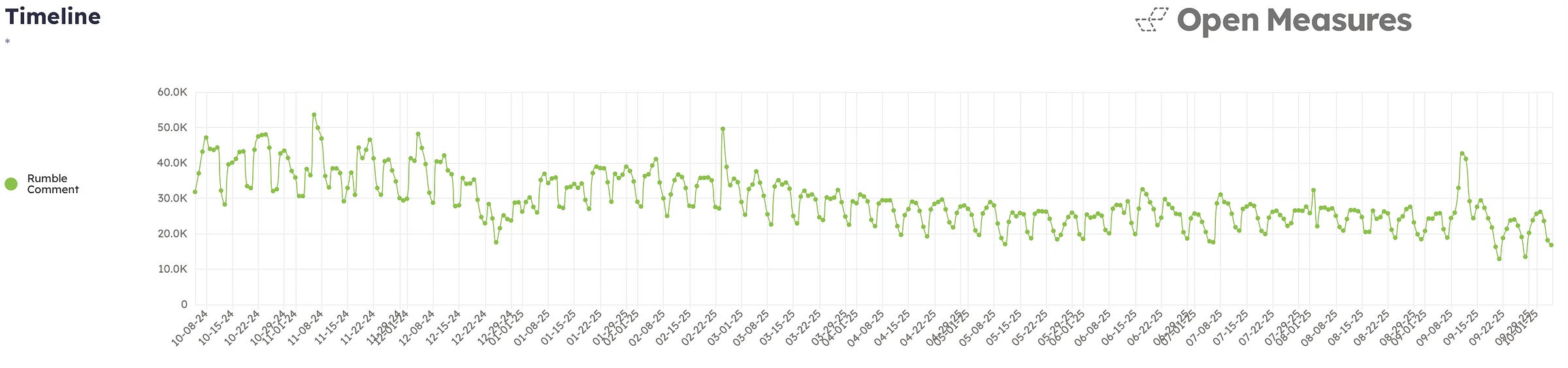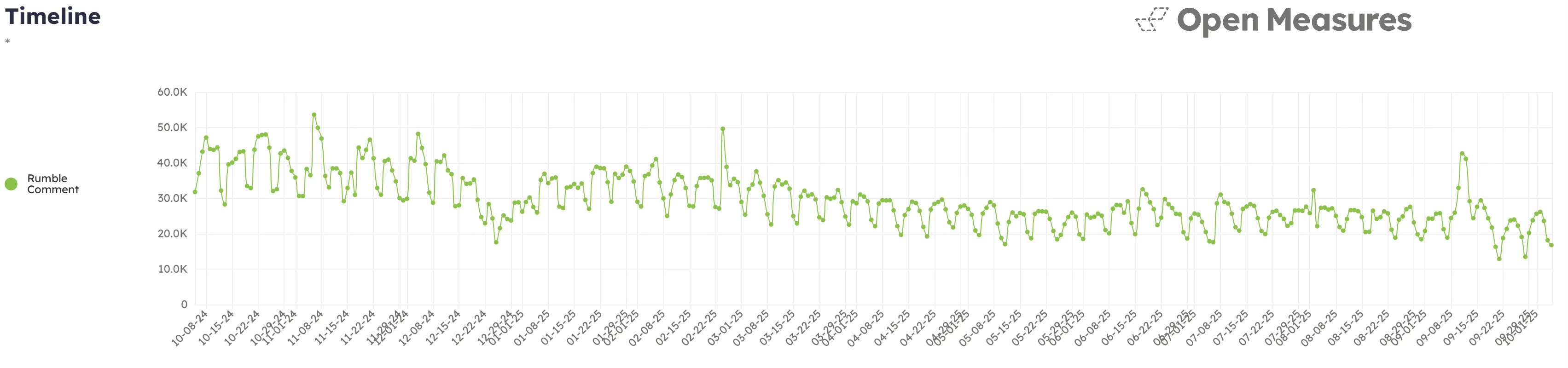Our researchers found that Rumble users uploaded at least 4.4 million videos and posted more than 10.7 million comments on the platform between Oct. 5, 2024 and Oct. 5, 2025.