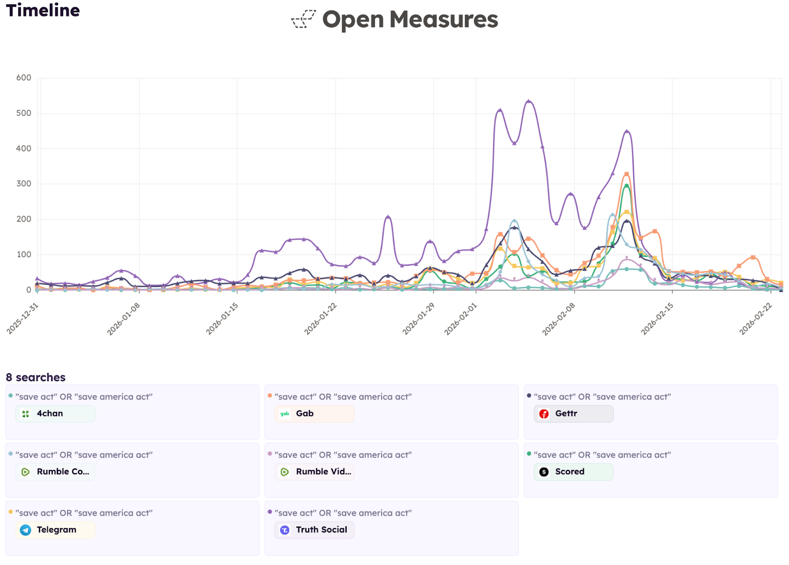 Open Measures’ researchers searched for posts that mentioned the SAVE Act between Jan. 1 and Feb. 24, 2026, on seven platforms harboring dominant pro-Trump communities in the US: 4chan, Gab, Gettr, Rumble, Scored, Telegram, and Truth Social. They used the following search string to identify posts for their analysis: