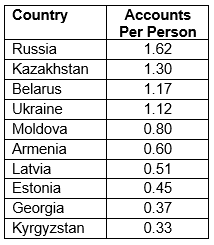 Some countries that were initially high on the list fell to the bottom. For example, the United States has the fifth most VK users but only 0.02 accounts per person when adjusted for population. The countries with the highest rate of accounts per person are all in Eastern Europe and Central Asia.